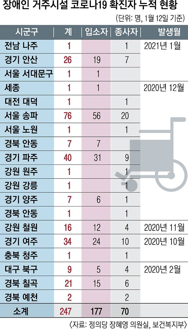 장애인 거주시설 집단감염은 그동안에도 수차례 발생했다. 보건복지부가 최근 정의당 장혜영 의원실에 제출한 ‘장애인 거주시설 코로나19 확진 통계’에 따르면 시설 입소 장애인 1158명 중 177명(15.8%), 종사자 725명 중 70명(9.6%)이 코로나19에 감염됐다. 또 전국 19개 시설 중 7곳(36.8%)에서 10명 이상의 집단감염이 발생했다.