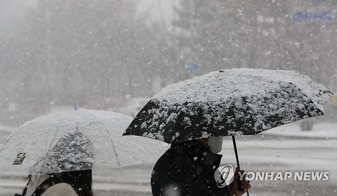 (청주=연합뉴스) 천경환 기자 = 18일 청주시 흥덕구 오송읍 거리를 시민들이 눈을 맞으며 걷고 있다. 2021.1.18