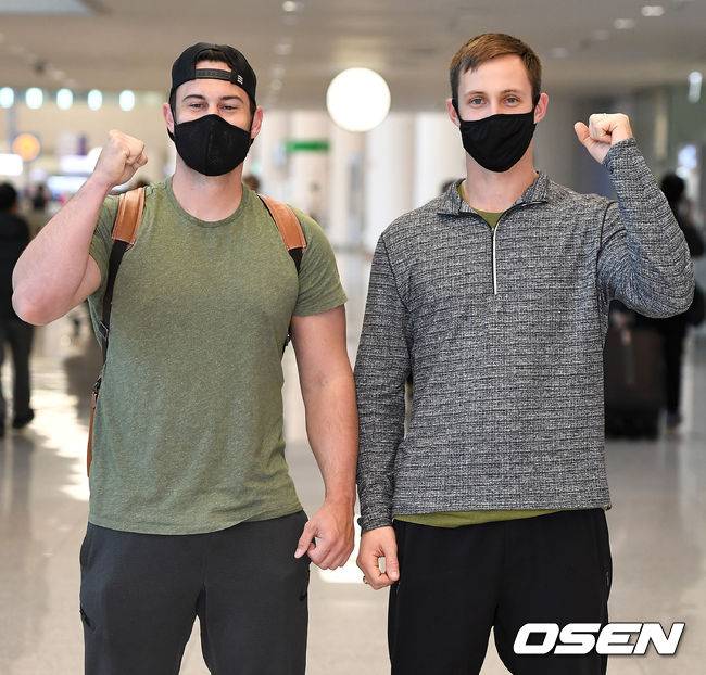 KIA 터커(왼쪽)과 멩덴이 입국해 포즈를 취하고 있다. / dreamer@osen.co.kr