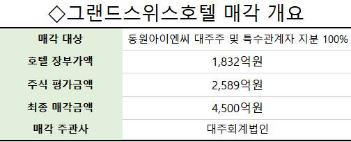 18일 투자은행(IB) 업계에 따르면 스위스그랜드호텔을 보유한, 동원아이엔씨의 예비입찰에 14곳의 기관들이 매입의향서를 제출했다. 동원아이엔씨는 이해승 손자인 이우영 회장 일가가 지분 100%를 갖고 있다. 재무제표를 보면 호텔의 장부가액은 약 1,830억 원, 주식 평가 금액은 2,590억 원이다. 최종 매각 금액은 실사조정과 경영권 프리미엄을 더해 약 4,500억 원이 거론되고 있다.