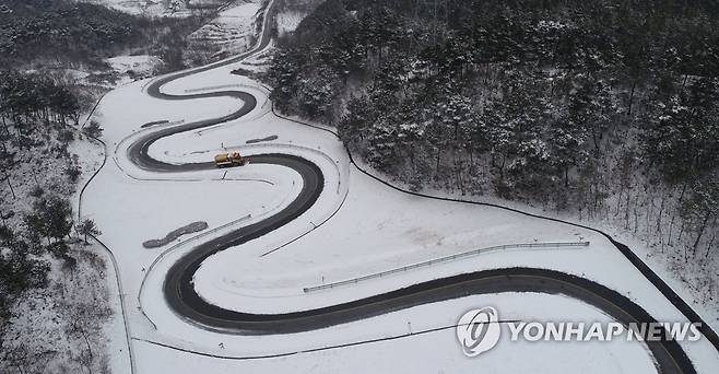 (서울=연합뉴스) 함박눈이 내린 18일 오후 경남 함양군 함양읍 구룡리 지안재에 하얀 눈이 쌓여있다. 2021.1.18