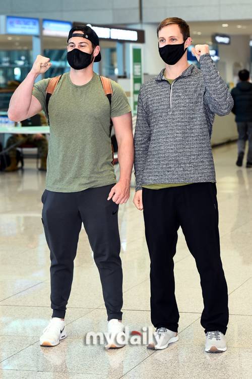 [마이데일리 = 인천 곽경훈 기자] 기아 프레스턴 터커(왼쪽)과 투수 다니엘 멩덴이 스프링캠프 합류를 위해 18일 오후 인천국제공항 2터미널로 입국한뒤 포즈를 취하고 있다.