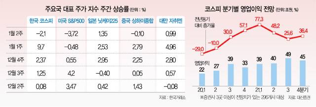 ◇‘유동성 장세 막 내릴라’ 살얼음판 걷는 증시=이런 약세에는 유동성 파티가 막을 내릴 수 있다는 우려가 자리 잡고 있다는 해석이 많다. 저금리와 달러 약세 등 유동성의 힘으로 증시를 끌고 갔는데 미국에서 통화정책의 스탠스가 바뀔 수 있다는 우려가 시장을 흔들고 있다는 분석이다. 이에 미국 국채 10년물 금리는 4일 연 0.9170%에서 지난주 1.1%까지 상승했다. 달러화도 반등세다. 이날 서울 외환시장에서 원·달러 환율은 전 거래일보다 4원 50전 오른 달러당 1,103원 90전에 거래를 마쳤다. 특히 그간 한국 증시가 과속 스텝을 밟았던 만큼 하락은 불가피하다는 진단은 지배적이다. 일정한 비중을 정해두고 자금을 굴리는 기관이 줄곧 한국 주식을 파는 것도 이 때문이라는 설명이 많다. 지난해 11월부터 약 33%가 오르면서 한국 주식의 수익률이 좋았던 만큼 비중 조절 차원에서 자연스럽게 매도에 나섰다는 뜻이다. 기업 이익의 개선이 주춤해진 것도 약세의 원인으로 꼽힌다. 대신증권에 따르면 지난해 4·4분기 코스피 영업이익 추정치(약 33조 원)는 전월 대비 1.4% 감소했다. 최석원 SK증권 리서치센터장은 “미국에서 금리가 오르면서 자금 흐름이 바뀔 수 있는 것 아니냐는 우려가 커졌고 실적 모멘텀도 이미 선반영됐다”며 “코스피가 10월 말 대비 30% 넘게 올랐는데 지속 가능한 상승장은 아니다”라고 설명했다. 삼성전자(005930)의 하락도 코스피지수 하락의 배경으로 풀이된다.
