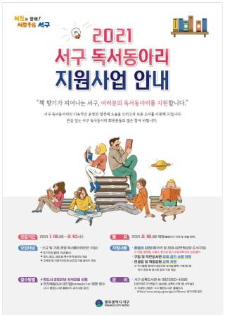 광주 서구(구청장 서대석)가 19일부터 지역 주민 독서생활의 기반이 되는 '2021년 독서동아리 지원 사업' 대상자를 모집한다고 밝혔다.