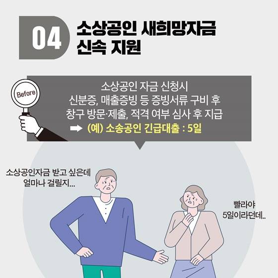 Before : 소상공인 자금 신청시 신분증, 매출증빙 등 증빙서류 구비 후 창구 방문·제출, 적격 여부 심사 후 지급 → (예) 소송공인 긴급대출 : 5일