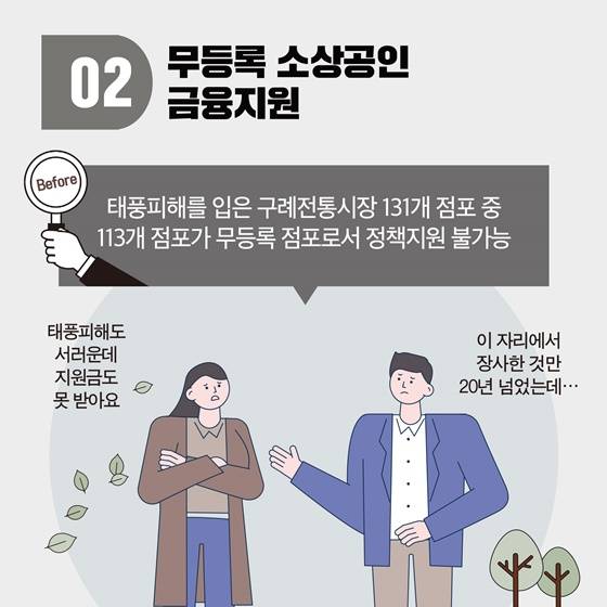 Before : 태풍피해를 입은 구례전통시장 131개 점포 중 113개 점포가 무등록 점포로서 정책지원 불가능