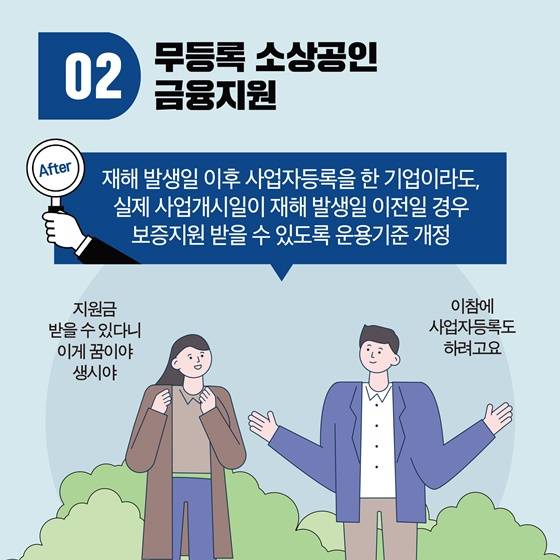 ▶After : 재해 발생일 이후 사업자등록을 한 기업이라도, 실제 사업개시일이 재해 발생일 이전일 경우 보증지원 받을 수 있도록 운용기준 개정