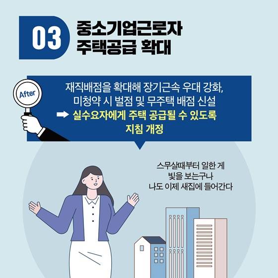 ▶After : 재직배점을 확대해 장기근속 우대 강화, 미청약 시 벌점 및 무주택 배점 신설 → 실수요자에게 주택 공급될 수 있도록 지침 개정