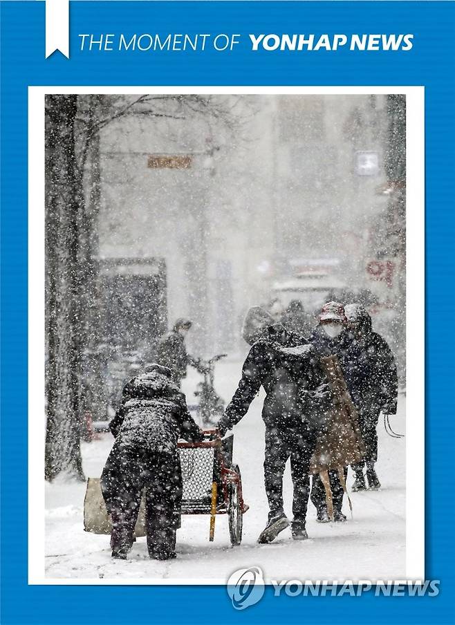 (서울=연합뉴스) 박동주 기자 = 눈이 내린 18일 오전 서울 송파구의 거리에서 한 청년이 수레를 끄는 할머니를 돕고 있다. 2021.1.18 [THE MOMENT OF YONHAPNEWS]