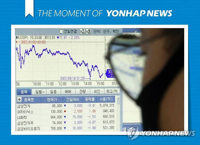 이날 코스피는 전 거래일보다 71.97포인트(2.33%) 떨어진 3,013.93에 거래를 마쳤다. 이날 오후 이재용 삼성전자 부회장의 법정 구속 소식에 삼성그룹 주가 일제히 하락하면서 내림 폭이 커졌다. 2021.1.18 [THE MOMENT OF YONHAPNEWS]
