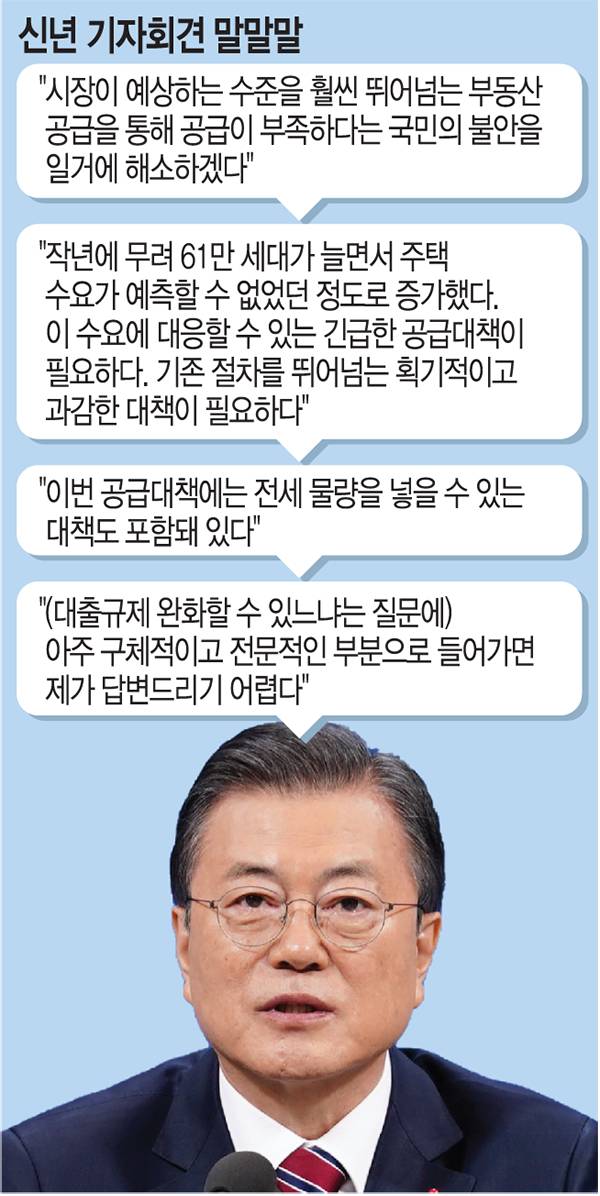 문재인 대통령은 18일 신년 기자회견에서 예전과 달리 여러 차례 주택 공급에 대한 의지를 드러냈다.