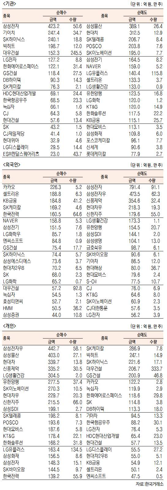 - [표]주간 유가증권 기관·외국인·개인 순매수·도 상위종목(1월 11일~15일)