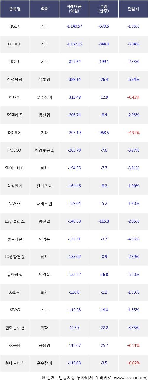 기관 투자자의 순매도 상위 20개 종목은 TIGER MSCI Korea TR, KODEX MSCI Korea TR, TIGER 200, 삼성물산, 현대차, SK텔레콤, KODEX 200선물인버스2X, POSCO, SK이노베이션, 삼성전기등이다.