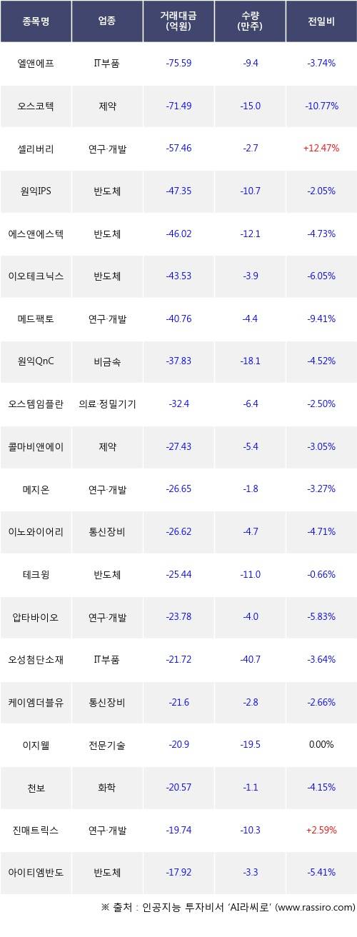 외국인 투자자의 순매도 상위 20개 종목은 엘앤에프, 오스코텍, 셀리버리, 원익IPS, 에스앤에스텍, 이오테크닉스, 메드팩토, 원익QnC, 오스템임플란트, 콜마비앤에이치등이다.