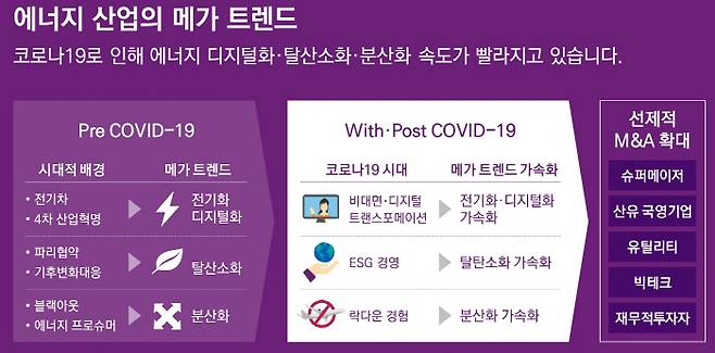김광석 삼정KPMG 에너지 산업 M&A 리더(부대표)는 "에너지원 중에서는 신재생 에너지와 가스, 밸류체인에서는 업스트림과 다운스트림이 M&A 타깃으로 부상하고 있다"며 "국내 기업들 역시 민첩하고 적극적인 M&A전략을 통하여 글로벌 에너지 시장의 지각변동에서 새로운 기회를 모색해야 한다"고 강조했다.