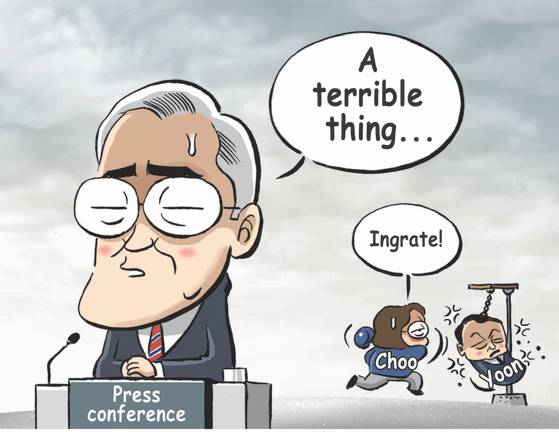 Asked his reaction to the death of an abused adopted child in a New Year’s press conference Monday, President Moon Jae-in proposed to allow adoptive parents to “cancel their adoption” to prevent child abuse. Critics said Justice Minister Choo Mi-ae’s attacks on Prosecutor General Yoon Seok-youl were like abuse of an adopted child. [PARK YONG-SEOK]