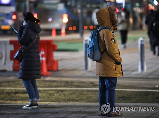 (서울=연합뉴스) 황광모 기자 = 서울 지역에 기온이 급강하 한 18일 저녁 서울 종로구 광화문에서 시민들이 두꺼운 외투를 입고 신호를 기다리고 있다.