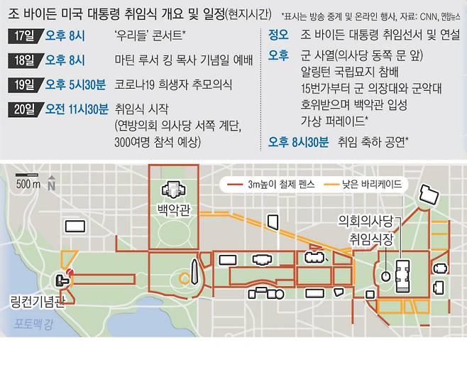 바이든 취임식 D-1, 취임 첫 메시지는 '통합'이지만..'군의 장벽' 쳐진 워싱턴