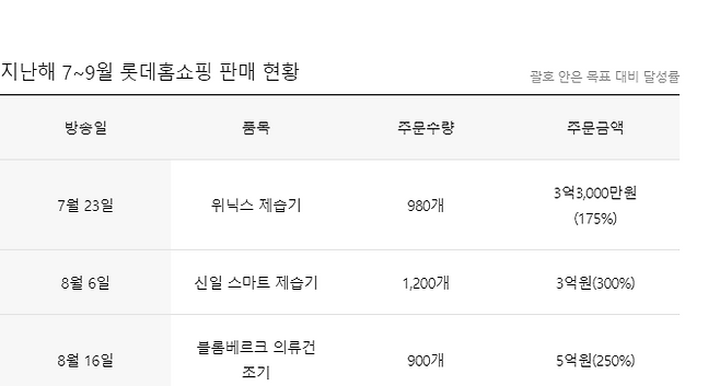 롯데홈쇼핑 관계자는 "IBM 예측값이 굉장히 섬세하고 정확도가 높다"며 "6개월 이내 몇월 며칠 기온이 얼마인지 집어낼 수 있다"고 설명했다. 실제 지난해 7~9월 역대급으로 길었던 장마와 태풍도 예상해 롯데홈쇼핑은 제습기, 의류건조기 물량을 늘려 편성했다. 그 결과 전년 동기 대비 주문 수량이 제습기는 113%, 건조기는 120% 늘었고, 상품별로 주문금액은 3억~5억원을 기록했다. 목표 대비 150~300% 초과 달성이다.