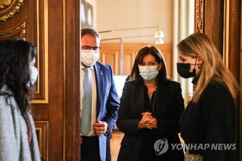 epa08946011 Paris mayor Anne Hidalgo (2-R) and Mayor of Spanish Merida Antonio Rodriguez Osuna (3-R), leave the meeting room, inside Hotel de Ville of Paris, Paris, France, 18 January 2021. Antonio Rodriguez Osuna, the president of the Group of World Heritage Cities of Spain, and the Mayor of Merida, Spain, held a bilateral meeting with Anne Hidalgo, the Mayor of Paris, in which he requested and obtained Paris's participation and help in an event scheduled to promote tourism in France. EPA/MOHAMMED BADRA
