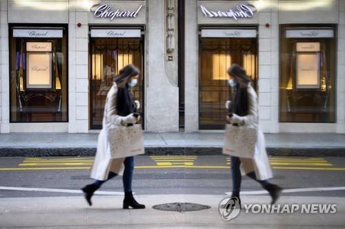 A person wears a protective face mask while walking in front of a closed jewellery shop during the first day of the closure of non-essential shops in Geneva, Switzerland, Monday, January 18, 2021. From Jan. 18, on Switzerland close non-essential shops and mandatory teleworking as well as the extension to the end of February of restaurant and sports facilities closures in a move to drastically reduce coronavirus infections. (Laurent Gillieron/Keystone via AP)