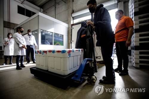 epa08946033 Officials of the Sao Paulo Health Secretary load trucks for regional distribution of 'Coronavac' vaccines against Covid-19, developed by the Chinese laboratory Sinovac, at Sao Paulo, Brazil, 18 January 2021. The Brazilian Ministry of Health yielded to the pressure of the governors and decided that 18 January will be the start of the vaccination against the coronavirus, which was initially scheduled to be on 20 January, announced the head of the portfolio, Eduardo Pazuello. Of the six million doses, 4,636,936 to be sent by the federal government to the states and another 1,357,640 will remain in Sao Paulo, which also began its regional distribution in heavily escorted trucks and by air from Guarulhos and Campinas. EPA/FERNANDO BIZERRA JR