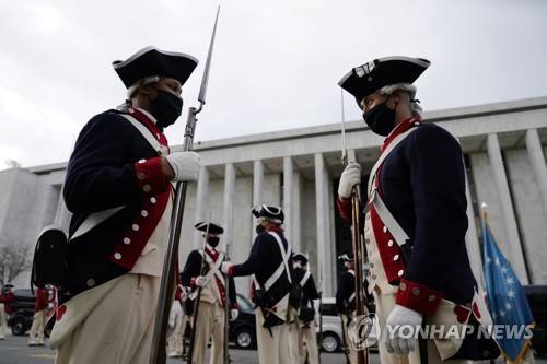 epa08946061 Members of the Commander in Chief's Guard arrive ahead of an inauguration rehearsal at the Capitol, in Washington, DC, USA, 18 January 2021. Biden will be sworn-in as the 46th president on 20 January. EPA/WILL OLIVER