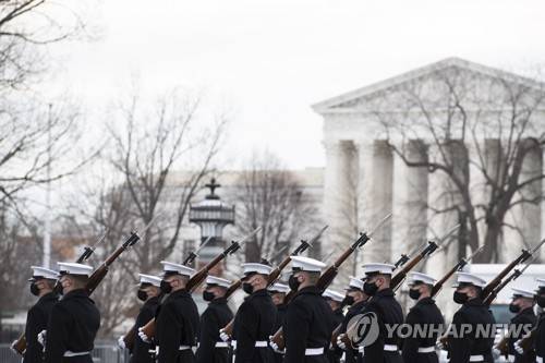 epa08946078 A military band passes the East Front of the US Capitol during the dress rehearsal in advance of the Inauguration of United States President-elect Joe Biden at the US Capitol in Washington, DC, USA, 18 January 2021. The Inauguration is scheduled for Wednesday, January 20, 2021. EPA/ROD LAMKEY/ POOL