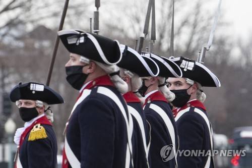 epa08946080 A military band passes the East Front of the US Capitol during the dress rehearsal in advance of the Inauguration of United States President-elect Joe Biden at the US Capitol in Washington, DC, USA, 18 January 2021. The Inauguration is scheduled for Wednesday, January 20, 2021. EPA/ROD LAMKEY/ POOL