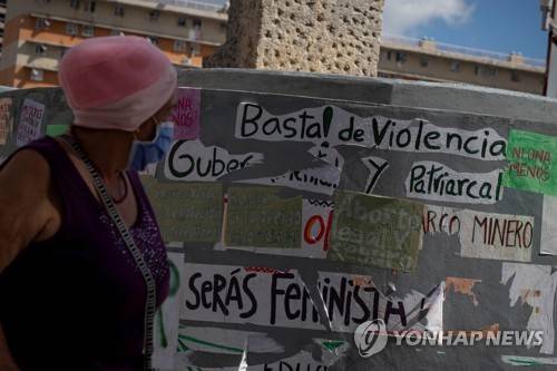 epa08946100 A woman walks in front of a wall with various messages in favor of abortion in Caracas, Venezuela, 16 January 2021 (issued 18 January 2021). A 13-year-old girl who was sexually abused by a neighbor voluntarily interrupted a 12-week pregnancy and ignited the debate on the decriminalization of abortion in Venezuela, where the Justice incarcerated the woman who helped her and set the aggressor free for lack of evidence. EPA/RAYNER PENA R.