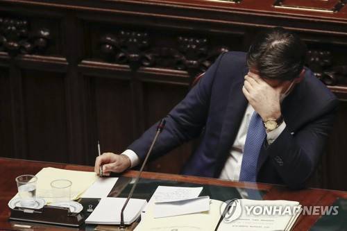 Premier Giuseppe Conte attends a debate at the lower chamber of Parliament, in Rome, Monday, Jan. 18, 2021. Conte fights for his political life with an address aimed at shoring up support for his government, which has come under fire from former Premier Matteo Renzi's tiny but key Italia Viva (Italy Alive) party over plans to relaunch the pandemic-ravaged economy. (AP Photo/Alessandra Tarantino, pool) POOL PHOTO