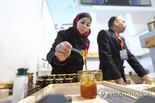 epa08946264 A beekeeper displaying products during the second Syrian Honey Festival at al-Jalaa Sports City in Damascus, Syria, on 18 January 2021. The festival is held by the Arab Beekeepers Union under the title 'honey is a food, medicine and cure.' EPA/YOUSSEF BADAWI