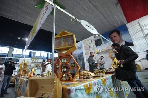 epa08946274 People buy honey jars during the second Syrian Honey Festival at al-Jalaa Sports City in Damascus, Syria, on 18 January 2021. The festival is held by the Arab Beekeepers Union under the title 'honey is a food, medicine and cure.' EPA/YOUSSEF BADAWI