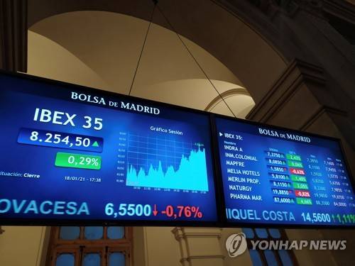 epa08946672 Several screens display the evolution of Spanish main index Ibex 35 at Madrid's Stock Exchange in Madrid, Spain, 18 January 2021. The IBEX 35, the main index of the Spanish Stock Exchange, rose a 0,29 percent at the end of the trading day to reach 8,254.5 points. EPA/Vega Alonso del Val