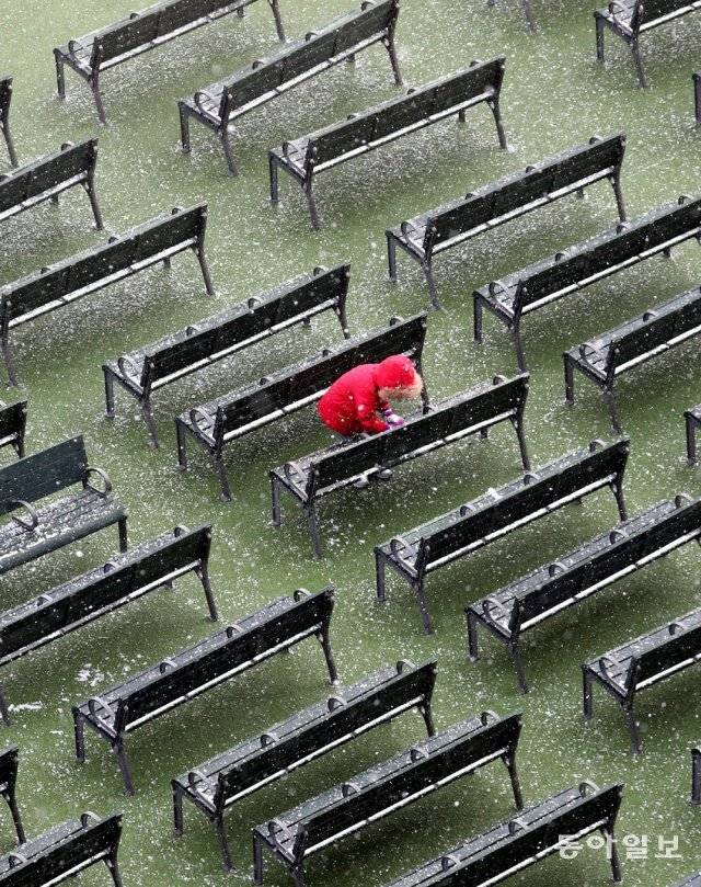갑작스러운 눈에 신이 난 아이가 총총 뛰어다니며 쌓인 눈을 뭉쳐봅니다. 멀리 있는 엄마에게 장난삼아 던지려면 더 많은 눈이 필요하겠지만, 아이는 온 세상의 눈을 다 쓸어 모을 것처럼 신이 났습니다.