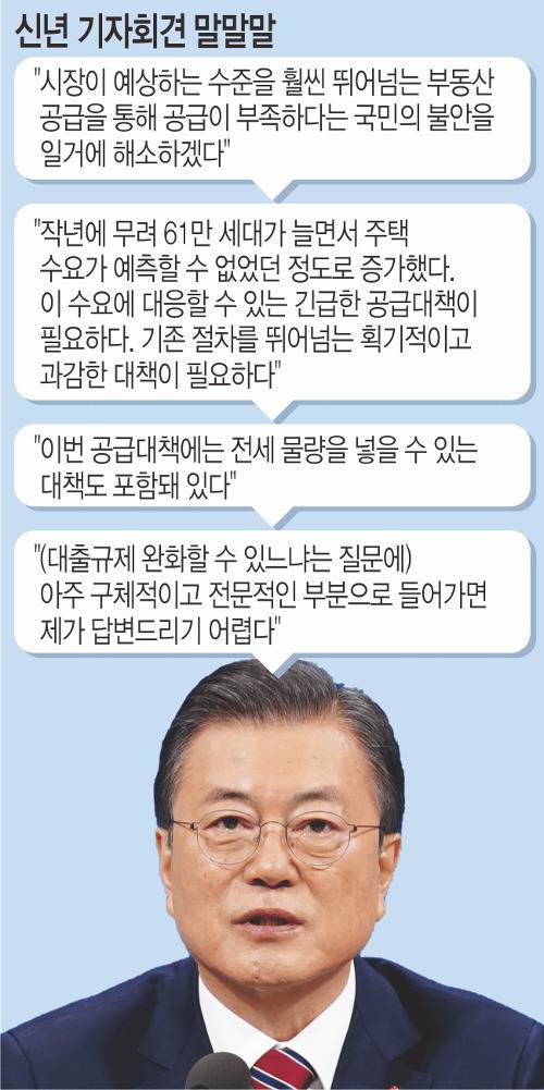 문 대통령은 규제지역 내 대출 규제가 실수요자의 내 집 마련에 걸림돌이 된다는 취지의 질문에 “구체적이고 전문적인 부분으로 들어가면 답변하기가 조금 어렵다”고 회피했다. 그런 뒤 “주택 매입이 어려운 만큼 공급이 부족하니 빠른 시일 내 공급 물량을 늘리는 방안을 설 전 발표하겠다”며 ‘동문서답식’ 답을 했다. 부동산 대란에 대한 이날 대통령의 답변이 서민들의 답답한 심경을 헤아리지 못했다는 비판이 나온 배경이다.