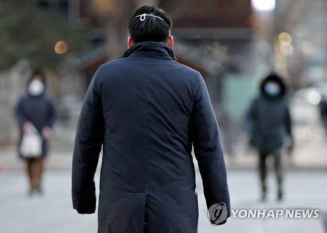 (서울=연합뉴스) 류영석 기자 = 서울 최저 기온이 영하 13도를 기록 중인 19일 오전 서울 광화문 광장에서 한 시민이 소매를 손까지 내린 채 걸어가고 있다. 2021.1.19