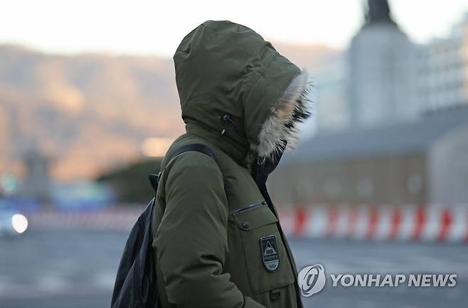 (서울=연합뉴스) 류영석 기자 = 서울 최저 기온이 영하 13도를 기록 중인 19일 오전 서울 광화문 광장에서 시민이 모자를 뒤집어 쓴 채 신호를 기다리고 있다. 2021.1.19