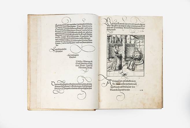 사진은 이번 전시에 소개되는 '토이어당크'(Theuerdank, 1517년). 이 책은 신성로마제국 막시밀리안 1세 황제의 명으로 만들어졌다. 2021.1.19
