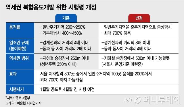 개정안은 지난해 8·4 대책의 후속 작업으로 역세권 고밀 개발을 위한 용적률 완화를 핵심으로 한다. 변창흠 국토교통부 장관이 취임 후 서울 307곳에 달하는 지하철역 인근 역세권 고밀 개발을 공급대책의 핵심으로 꼽은 만큼 이번 시행령 개정이 주택공급의 '물꼬'를 튼 셈이다.