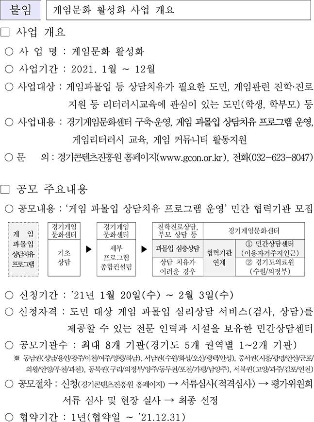 경기콘텐츠진흥원은 오는 20일부터 다음달 3일까지 ‘게임 과몰입 상담·치유 프로그램’의 일환으로 ‘경기게임문화센터 - 민간 상담센터 모집’을 실시한다.