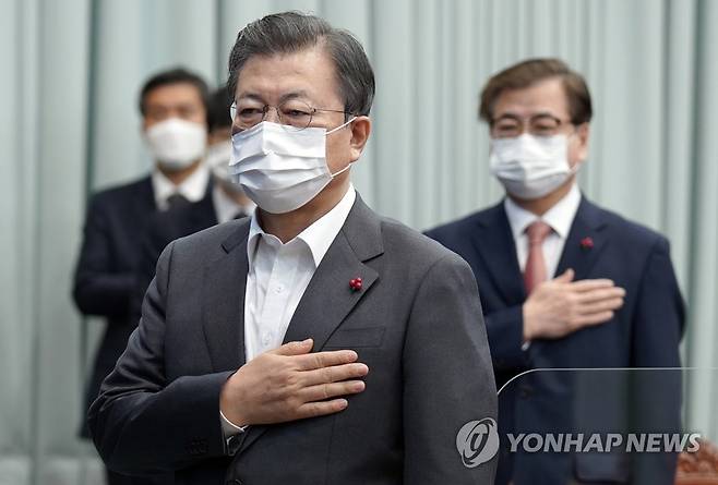 (서울=연합뉴스) 최재구 기자 = 문재인 대통령이 19일 청와대에서 열린 국무회의에서 국기에 경례하고 있다. 2021.1.19
