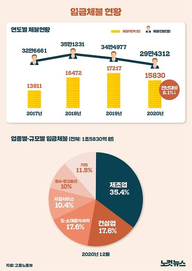 고용노동부의 발표에 따르면, 코로나19 대유행에도 작년 임금체불발생액은 1조 5830억원으로 전년 대비 8.1% 감소한 것으로 나타났다. 체불 인원 또한 29만 4312명으로 젼년 대비 14.7% 감소했다.