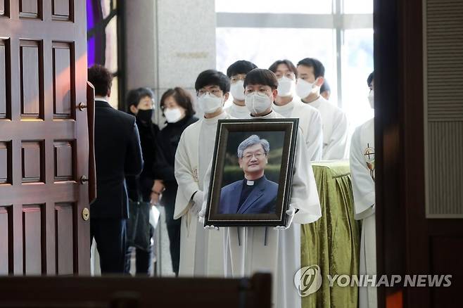 (광주=연합뉴스) 천정인 기자 = 19일 오전 광주 서구 염주동성당에서 고(故) 정형달 바오로 신부에 대한 장례 미사가 진행되고 있다. 2021.1.19