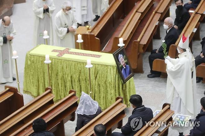 (광주=연합뉴스) 천정인 기자 = 19일 오전 광주 서구 염주동성당에서 고(故) 정형달 바오로 신부에 대한 장례 미사가 진행되고 있다. 2021.1.19