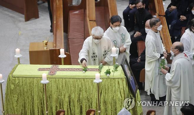 (광주=연합뉴스) 천정인 기자 = 19일 오전 광주 서구 염주동성당에서 고(故) 정형달 바오로 신부에 대한 장례 미사가 진행되고 있다. 2021.1.19