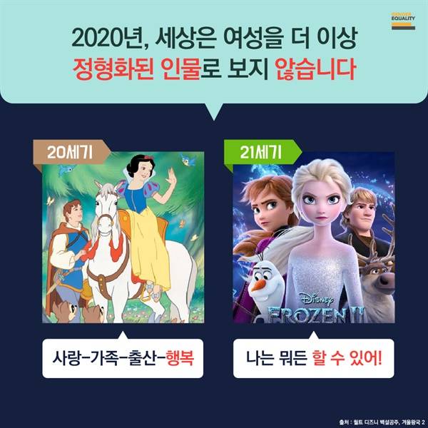 | ▲ 과거의 디즈니 여성캐릭터와 현재의 디즈니 여성캐릭터 그림이 비교되어 있고 20세기 여주인공 그림 하단에는 '사랑-가족-출산-행복'이라는 문구가, 21세기 여주인공 그림 하단에는 '나는 뭐든 할 수 있어!'라는 문구가 적혀있다. |