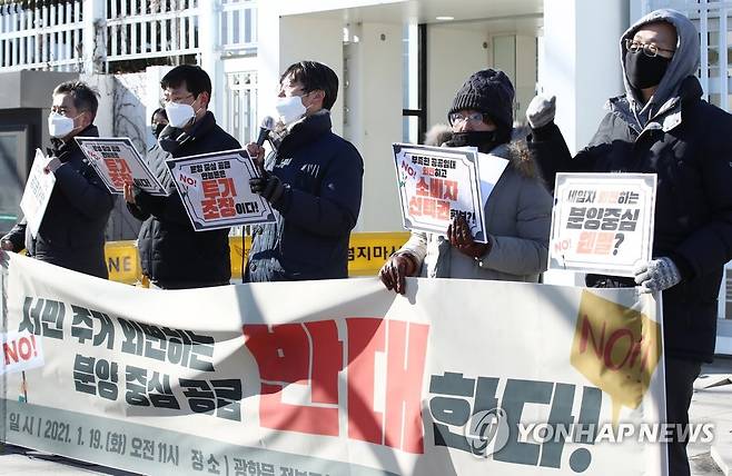 (서울=연합뉴스) 진연수 기자 = 주거권네트워크 관계자들이 19일 정부서울청사 앞에서 '투기 조장 공급 대책 반대, 서민 주거 안정 대책 촉구 기자회견'을 하고 있다. 2021.1.19