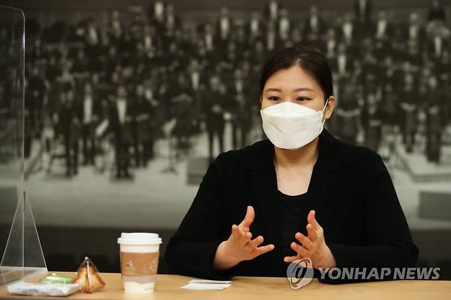 (서울=연합뉴스) 류효림 기자 = 2021년 서울시향 첫 연주회 지휘를 맡은 성시연 지휘자가 서울 종로구 서울시립교향악단에서 취재진과 인터뷰하고 있다. 2021.1.19