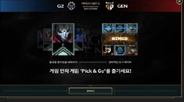 ‘리그오브레전드(LoL) 챔피언스 코리아’(LCK) 경기를 보면서 예측 게임도 즐길 수 있는 서비스가 나왔다. 아레나캐스트는 ‘픽앤고’의 비공개 테스트를 20일 시작한다. 라이엇게임즈와의 협력을 통해 LCK 트위치 전용공식채널에서 서비스한다.